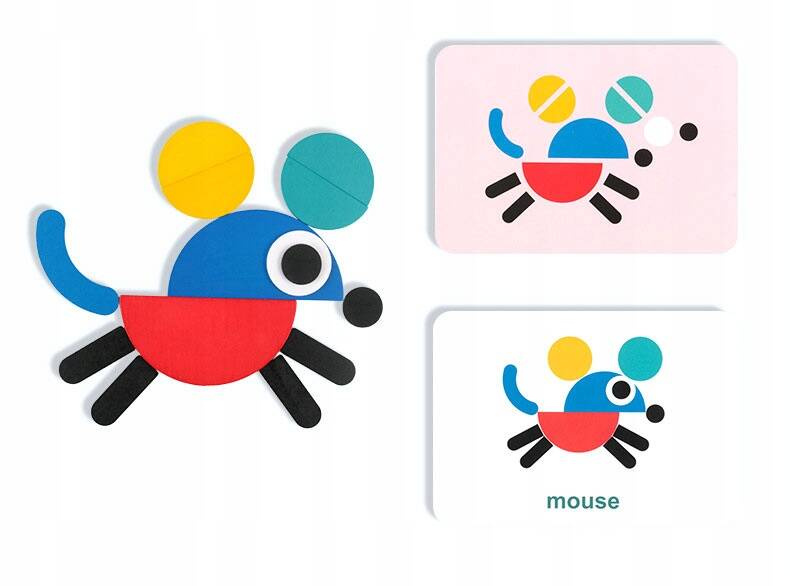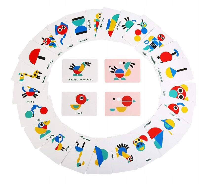 Zestaw zawiera aż 60 kart z obrazkami np. słonik, bałwanek, sowa, rakieta, domek i wiele innych. Każdy rysunek podpisany jest po angielsku. Z drugiej strony karty namalowana jest instrukcja, jakich klocków należy użyć aby ułożyć wzór z obrazka. Dziecko może wybrać elementy samodzielnie lub skorzystać z dołączonej instrukcji.