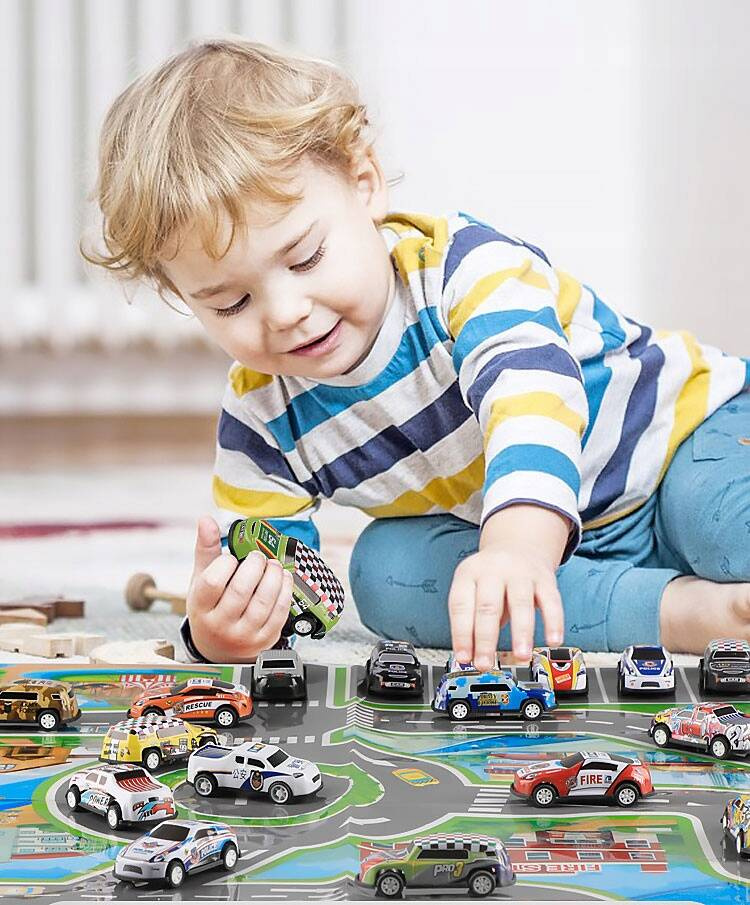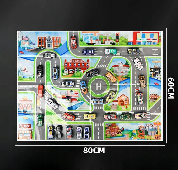 W zestawie znajdziesz kolorową mapę z drogami. Odwzoruj prawdziwy ruch drogowy! Z pomocą mapy możesz nauczyć dziecko zasad panujących na drodze. Zabawa połączona z nauką jest najlepsza!