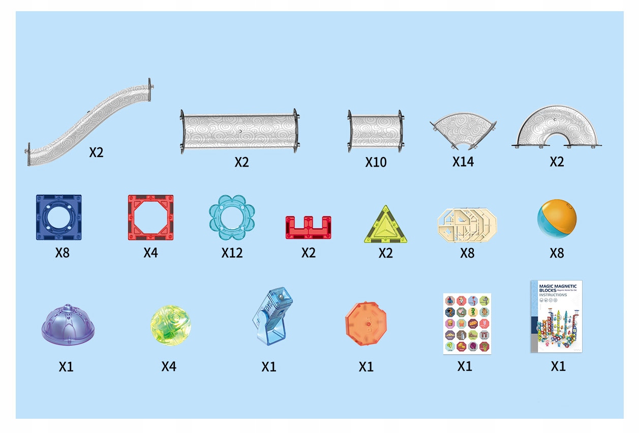 Klocki charakteryzują się łatwością łączenia poszczególnych elementów w dowolny sposób oraz pod różnymi kątami. Na bokach każdego klocka są wbudowane mocne magnesy neodymowe, którą z dużą siłą łączą ze sobą kolejne elementy tworząc przeróżne figury. Klocki można układać płasko tworząc tory, wężyki itp oraz przestrzennie budując przeróżne figury trójwymiarowe. W ten sposób dzieci będą mogły pobudzać swoją wyobraźnię przestrzenną.