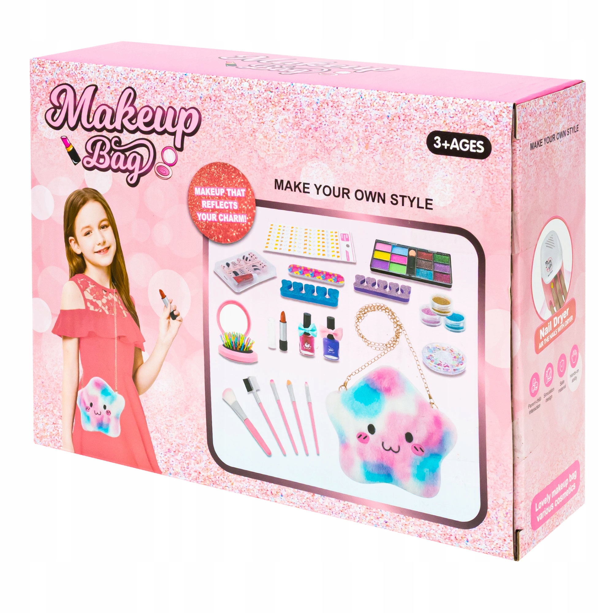 Duża gama kolorowych cieni, szminek czy ozdób skusi małą artystkę do zabawy. Akcesoria do paznokci pozwolą na wiele pięknych stylizacji. Osuszacz działa jak prawdziwy. Wystarczy włożyć baterię i ułożyć rączkę w urządzeniu delikatnie dociskając jego spód (przycisk). Lakiery po zaschnięciu zdejmuje się jak zwykłą naklejkę.