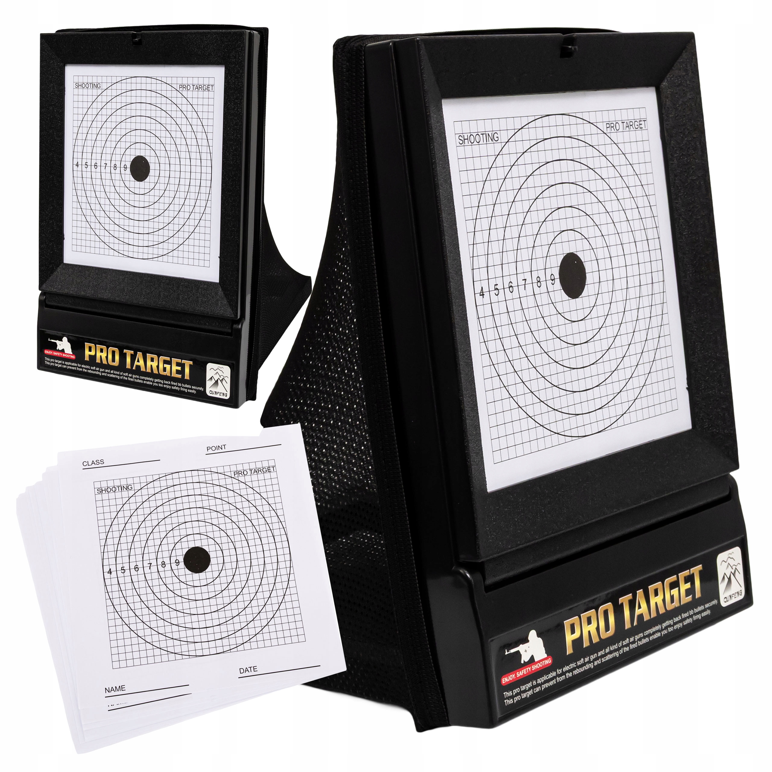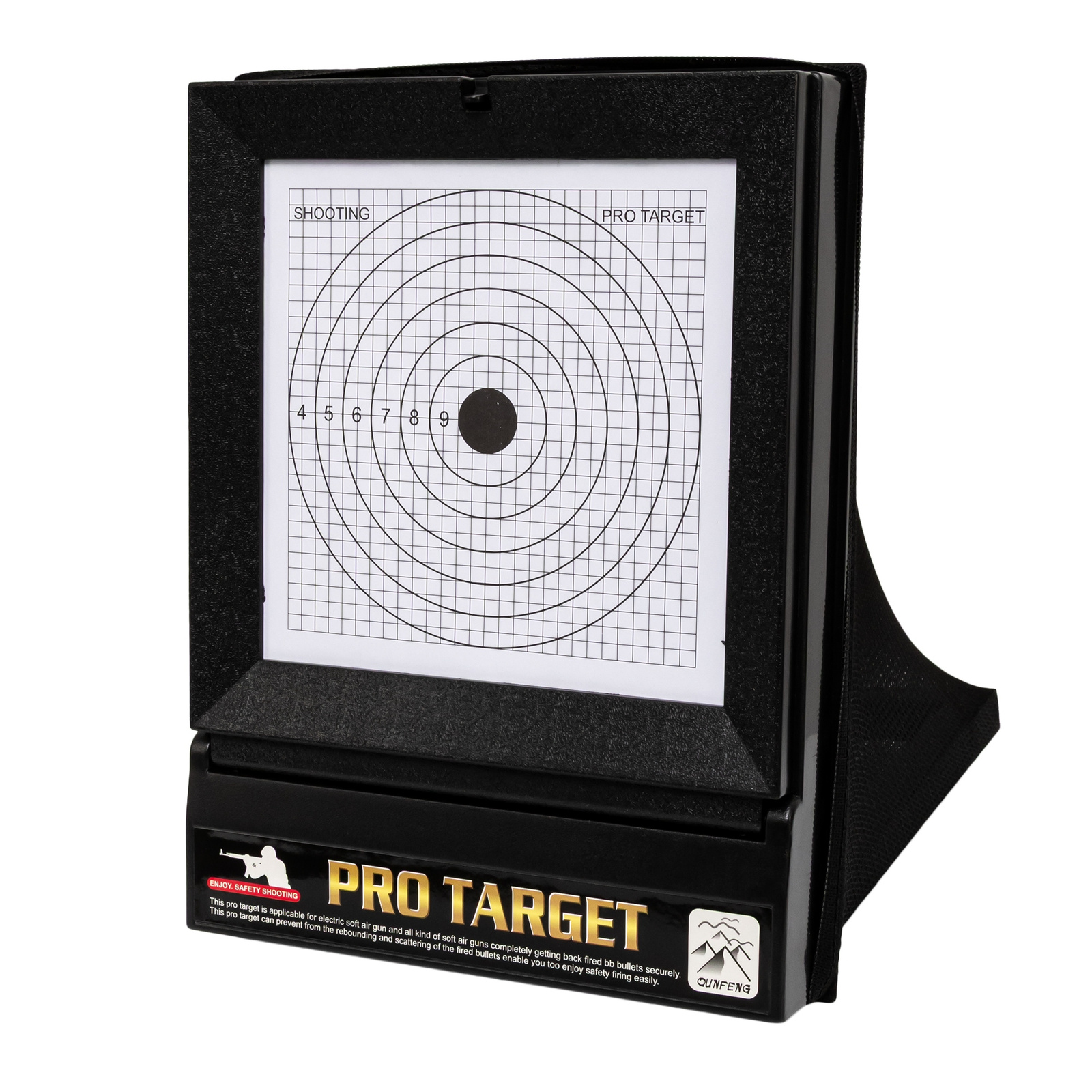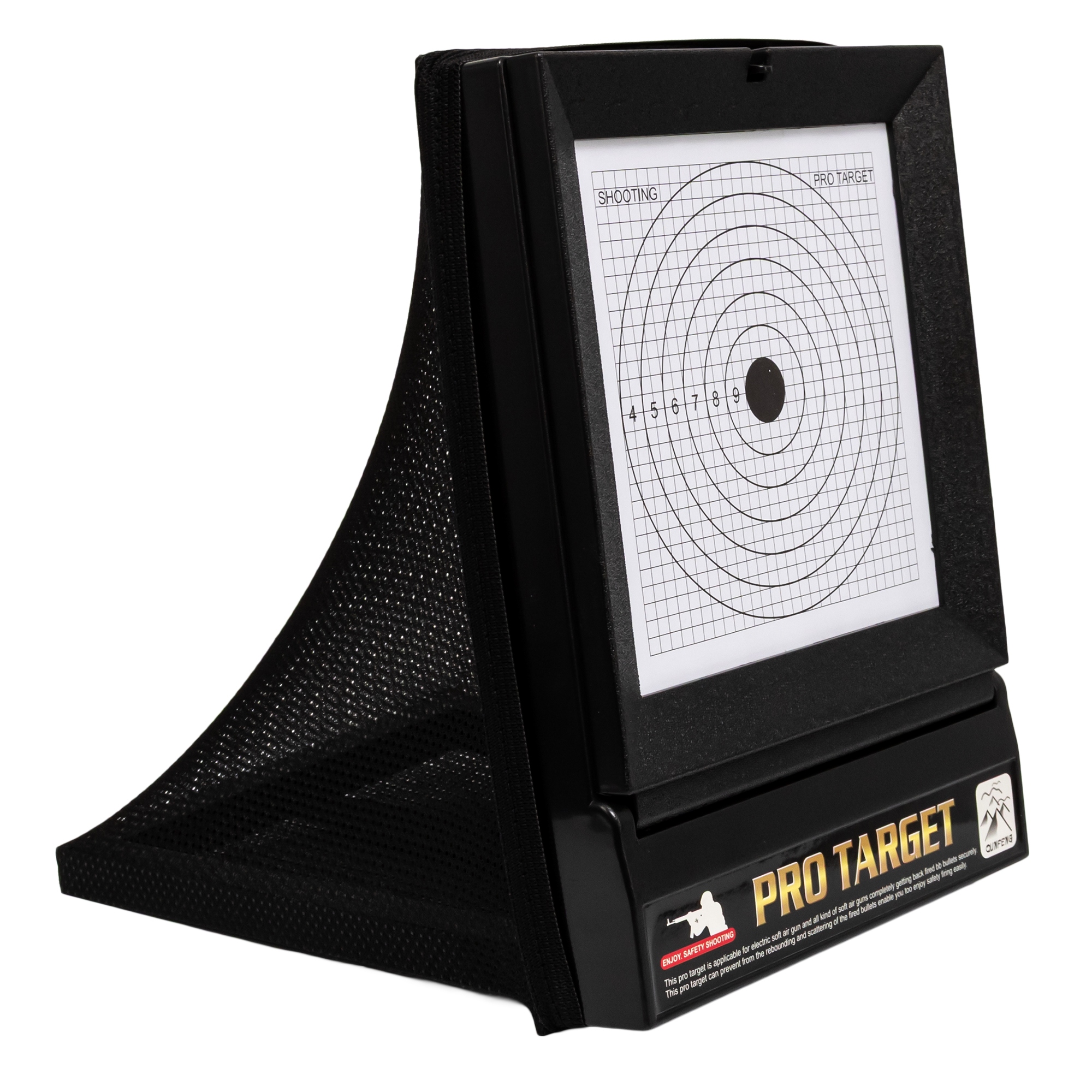 Zestaw umożliwia bezpieczne strzelanie zarówno w domu, jak i na zewnątrz. Dzięki siatce umieszczonej za tarczą wszystkie pociski zostają zatrzymane – bez bałaganu, bez zagubionych kulek i bez ryzyka odbicia.