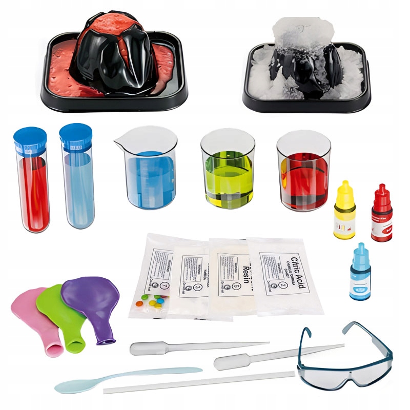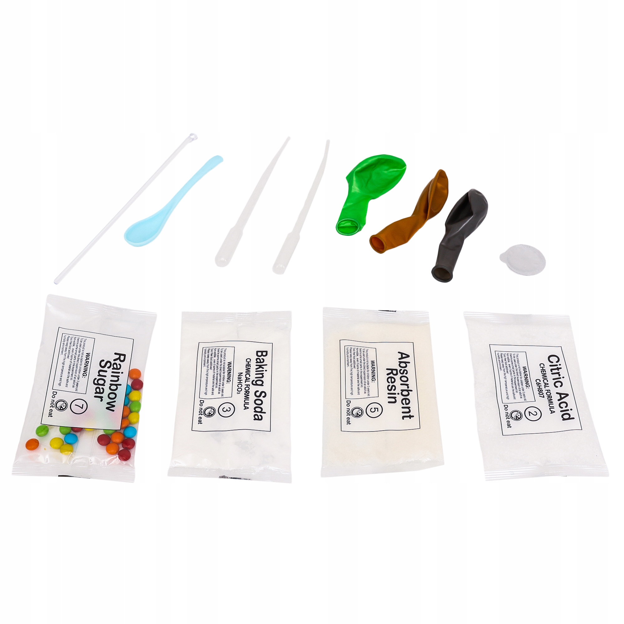 Zestaw jest bardzo duży i odpowiednio rozbudowany aby można było wykonać z jego pomocą wiele ciekawych eksperymentów. W opakowaniu znajdziesz między innymi barwniki, pipetki, fiolki, proszki, balony, mieszalniki, kubeczki z miarką itp.