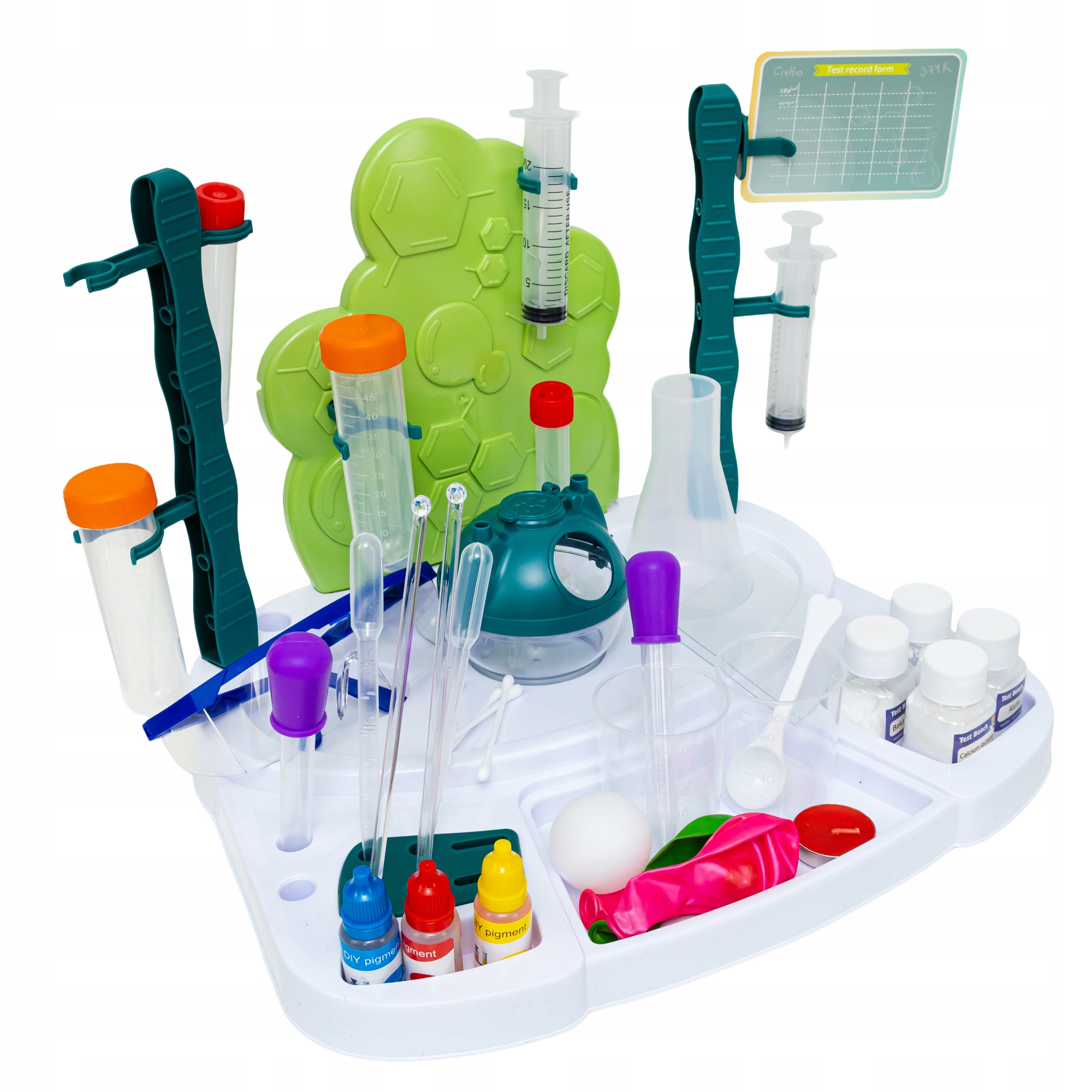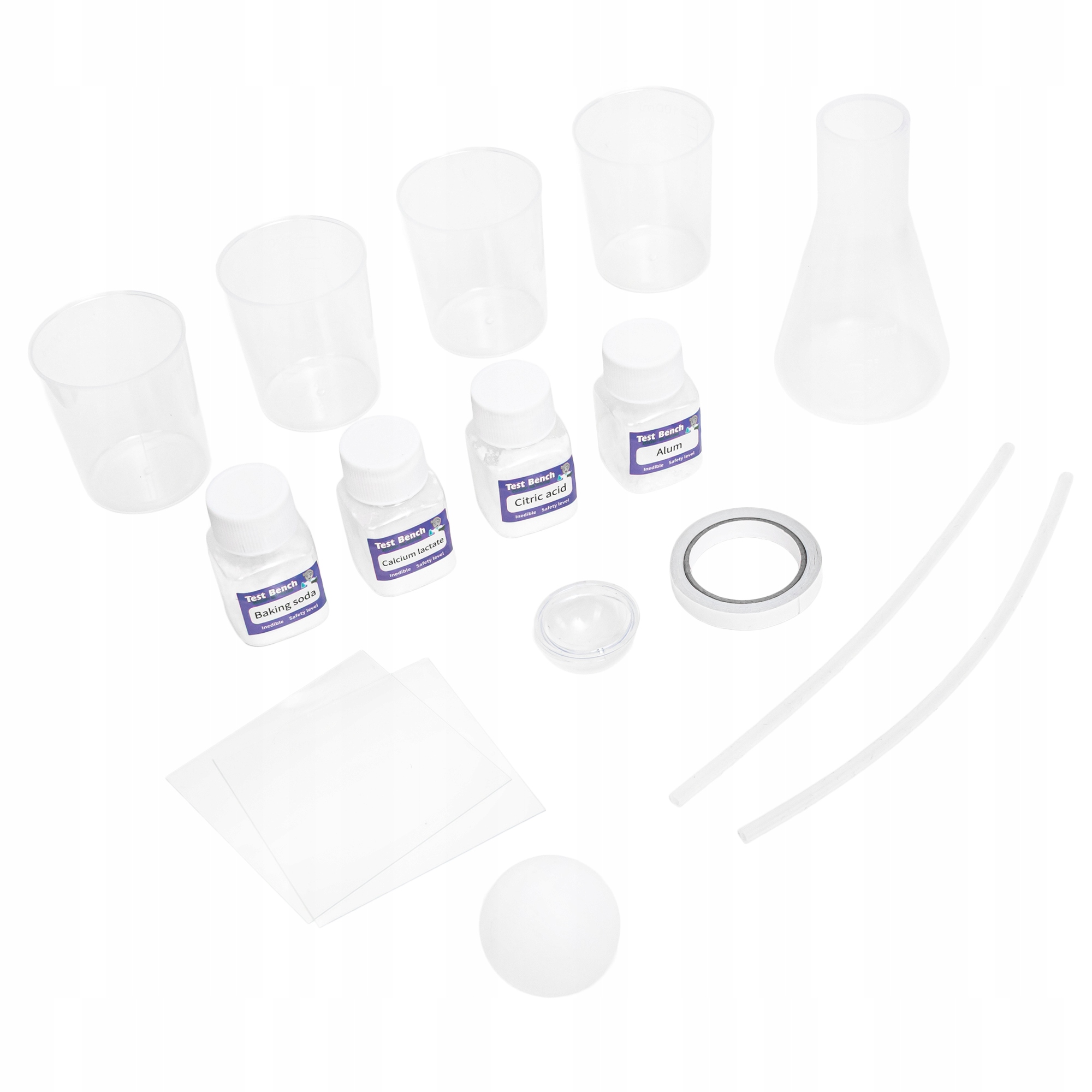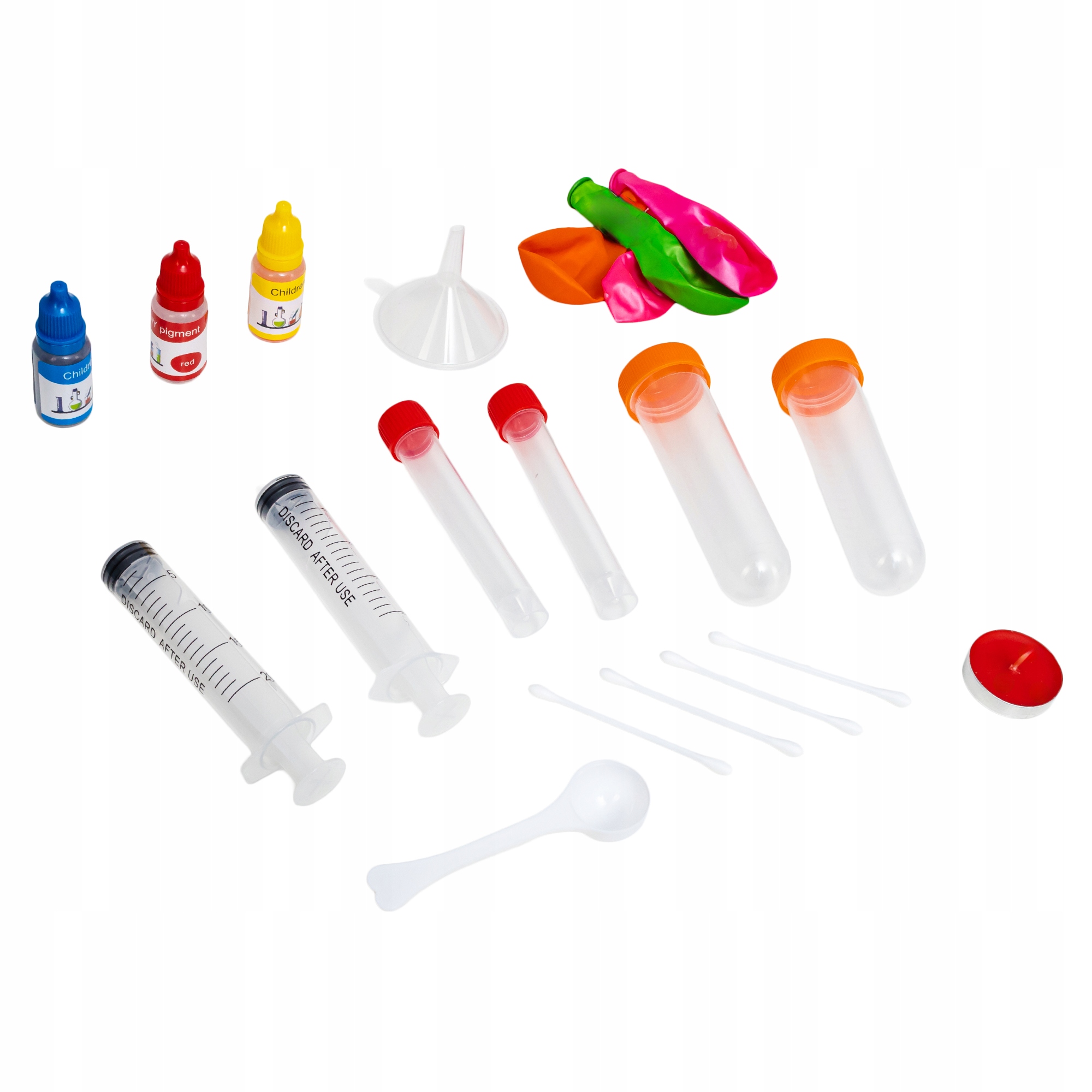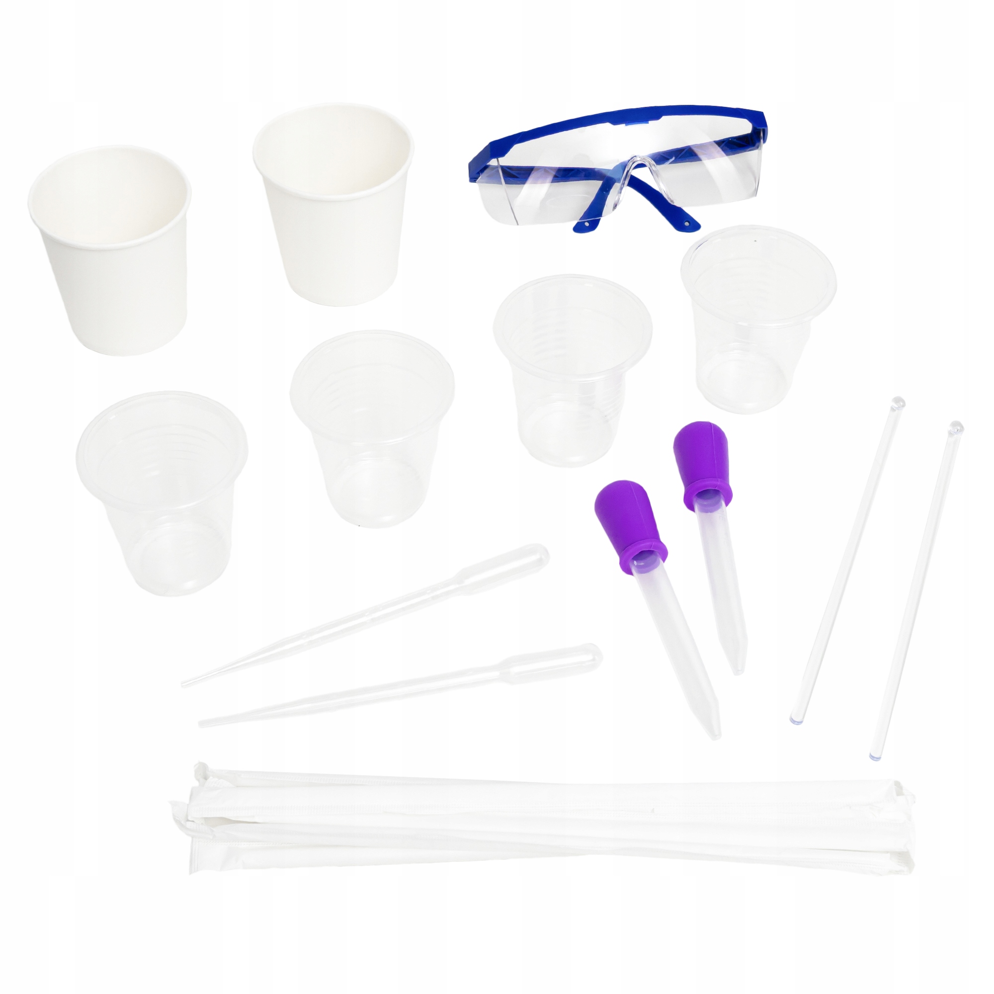 Zestaw jest bardzo duży i odpowiednio rozbudowany aby można było wykonać z jego pomocą wiele ciekawych eksperymentów. W opakowaniu znajdziesz między innymi barwniki, pipetki, fiolki, proszki, balony, mieszalniki, kubeczki z miarką itp.