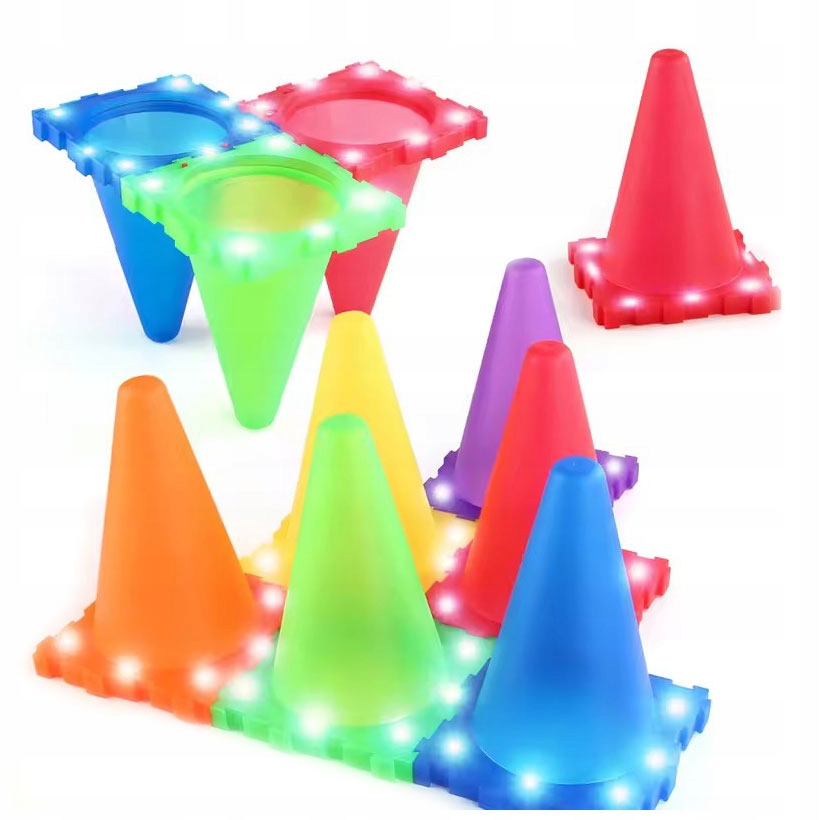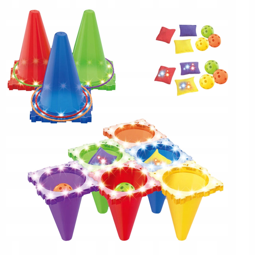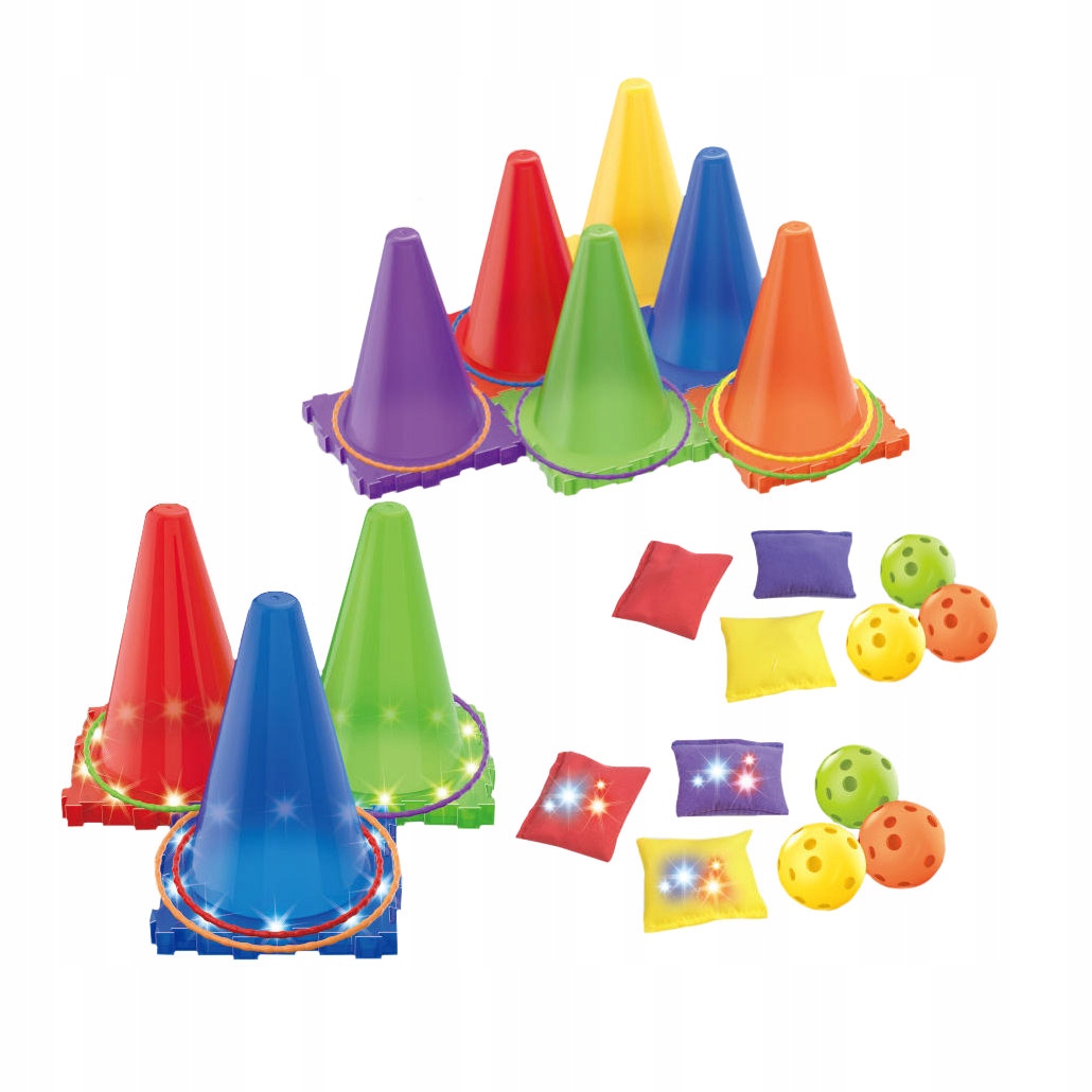 Zestaw do gier zręcznościowych z efektami świetlnymi to idealna propozycja na aktywną zabawę w domu, ogrodzie czy przedszkolu. Wciągająca gra polega na rzucaniu piłeczek, woreczków lub obręczy do kolorowych stożków i otworów, które dodatkowo podświetlane są kolorowymi diodami LED.