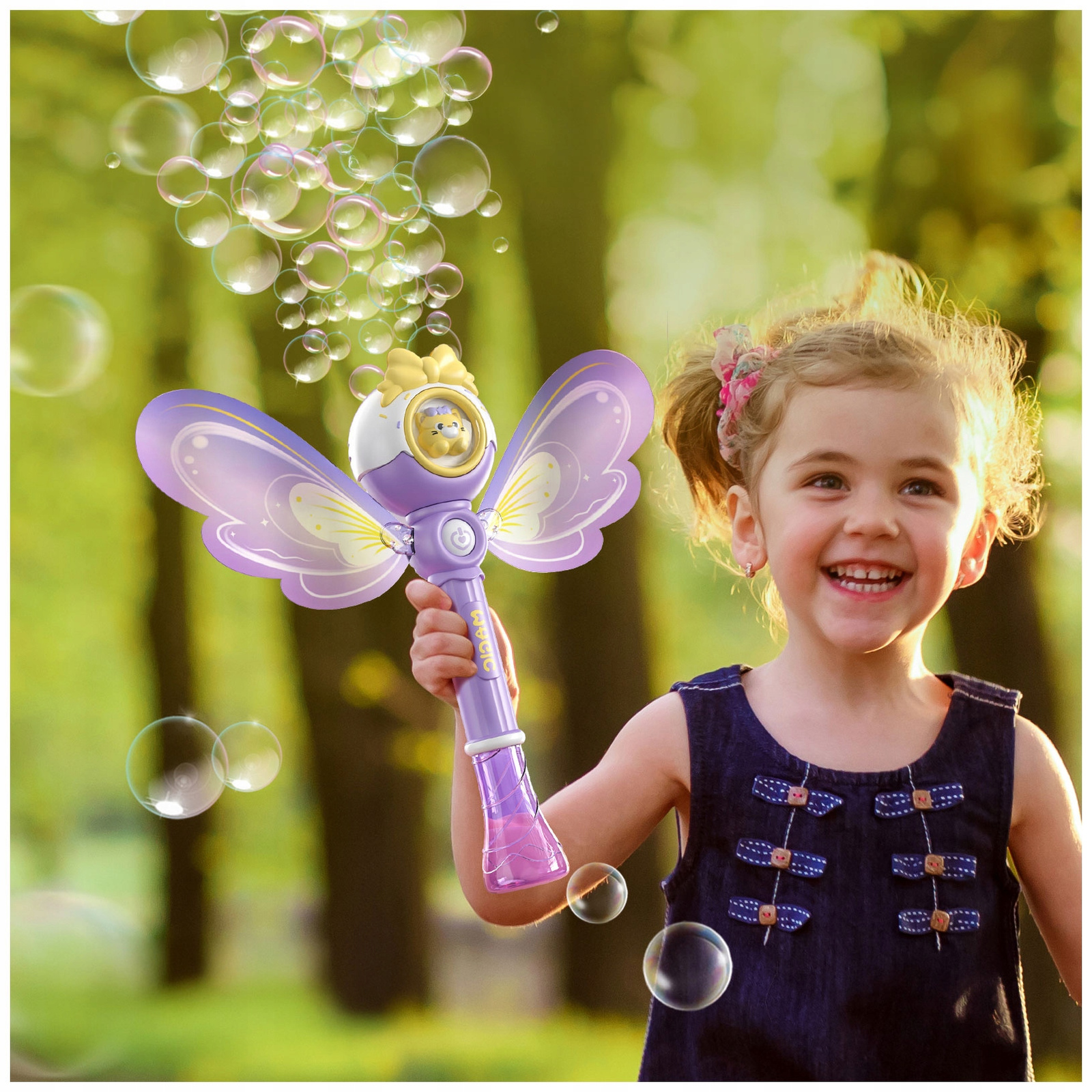 Uroczy design ze skrzydełkami, kolorowe podświetlenie i bańki sprawiają, że zabawka zachwyca zarówno maluchy, jak i dorosłych. Świetna do ogrodu, na plażę, przyjęcie urodzinowe, a nawet wesele!