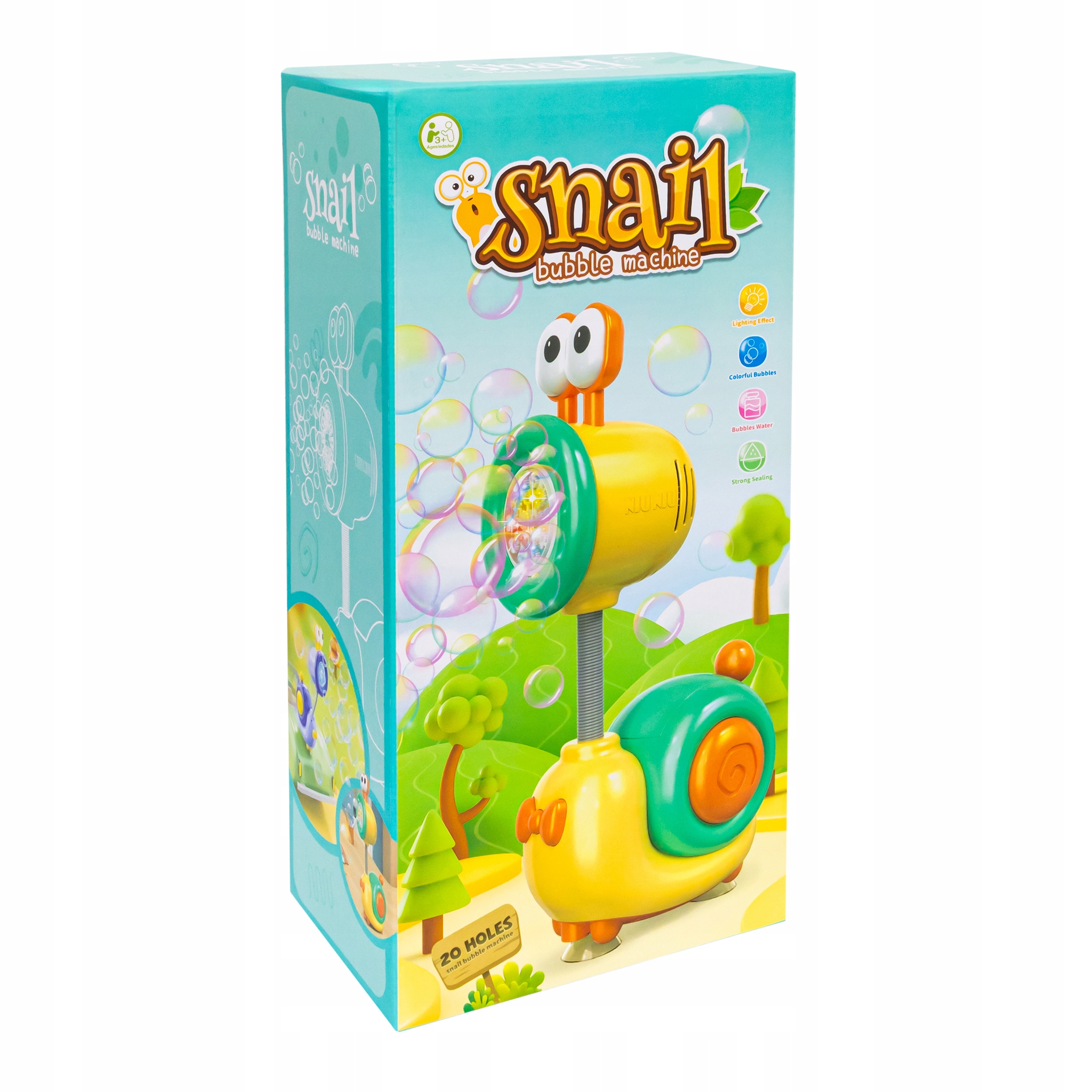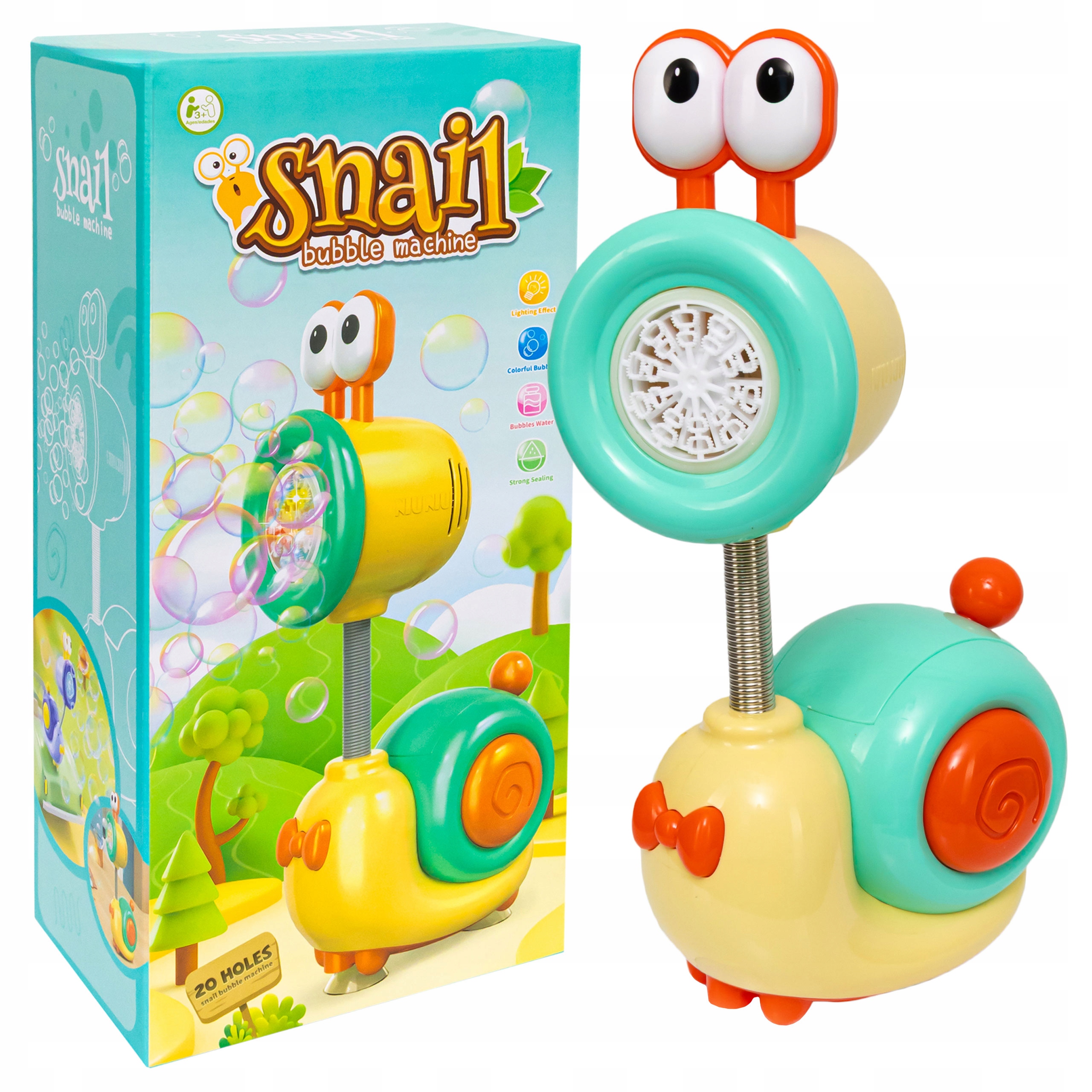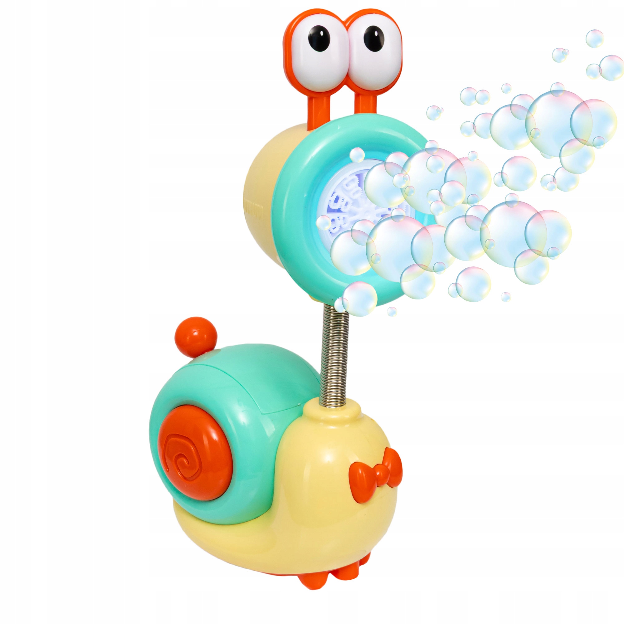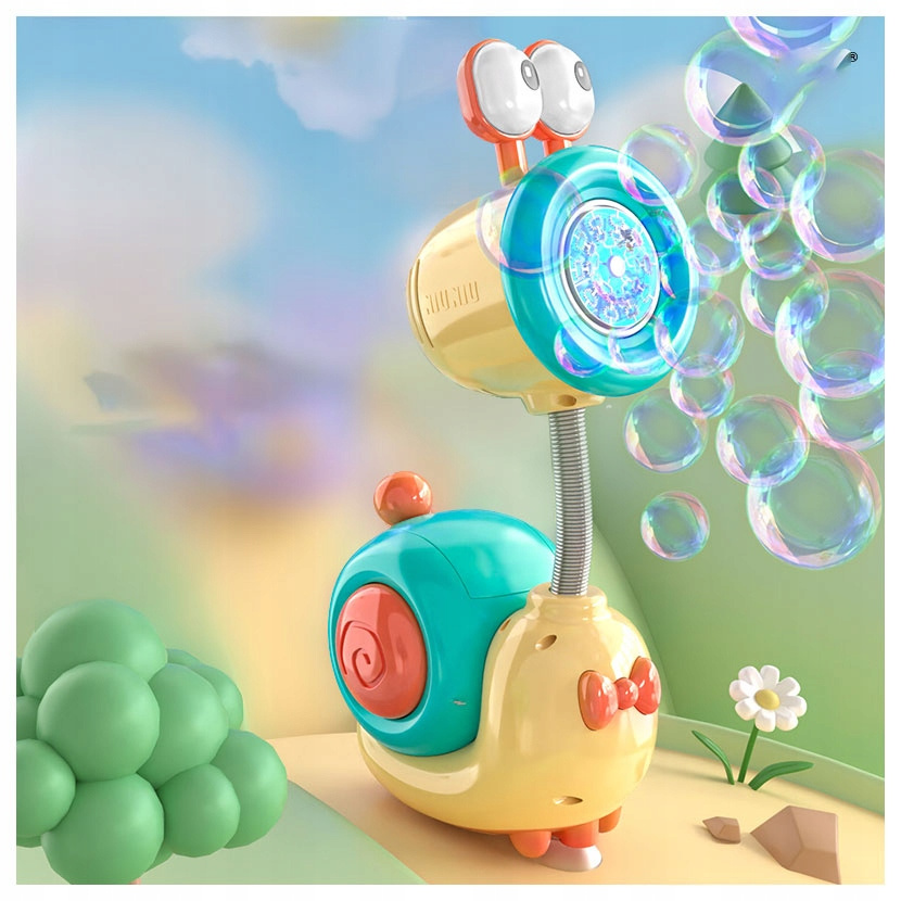 Zabawna maszynka do baniek w kształcie ślimaka to idealna propozycja na radosną zabawę w domu, ogrodzie lub na przyjęciu urodzinowym. Uroczy wygląd, kolorowe światełka i setki baniek w kilka sekund sprawiają, że dzieci nie mogą oderwać od niej wzroku!