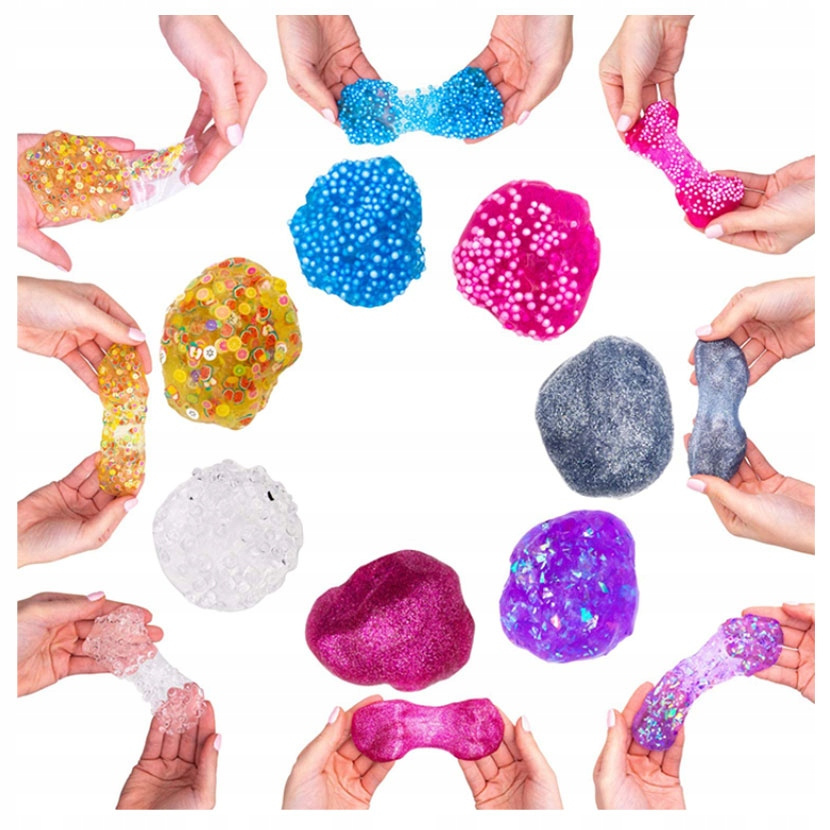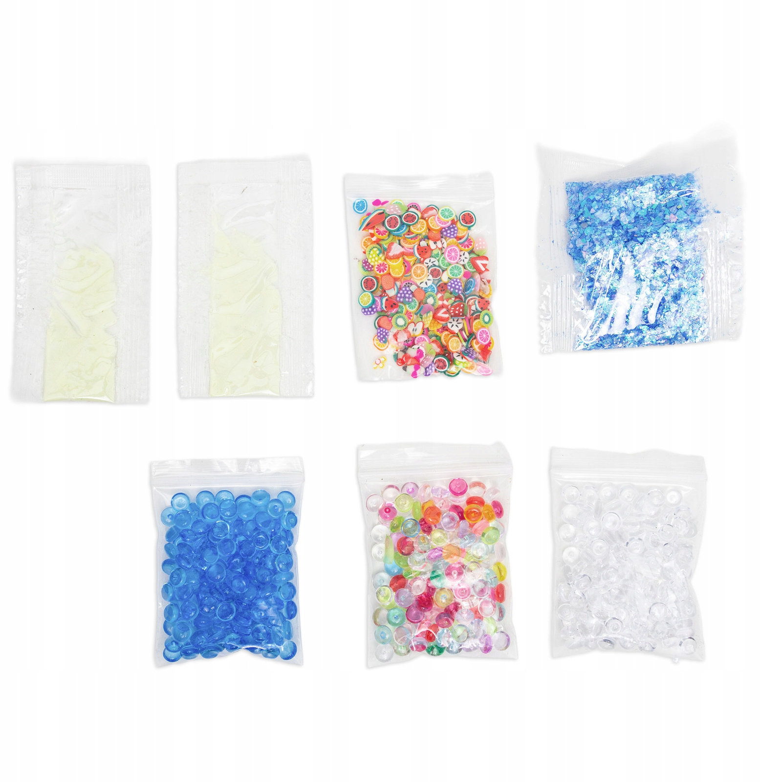 W pudełku znajduje się wszystko, czego potrzeba, by tworzyć niepowtarzalne masy – od kolorowych slime’ów, przez brokaty, koraliki, kulki, aż po foremki i narzędzia do modelowania.