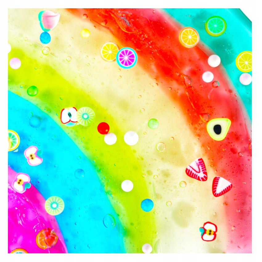 Do masy można dodać kolorowe ozdoby z zestawu – mini owoce, koraliki, kulki, brokat, świecący proszek – tworząc niepowtarzalne kompozycje. Nic nie stoi na przeszkodzie, by mieszać kolory i tworzyć efekty tęczy, marmuru lub kolorowych deserów. Po zakończonej zabawie wystarczy włożyć slime z powrotem do pojemniczka, aby zachował świeżość.