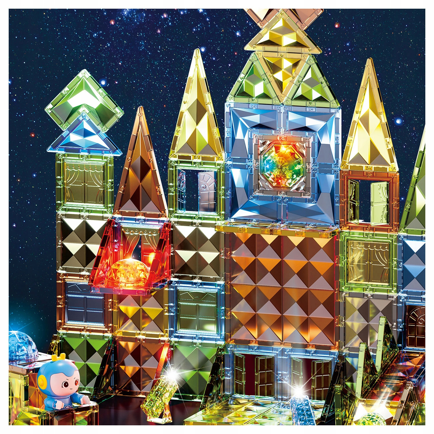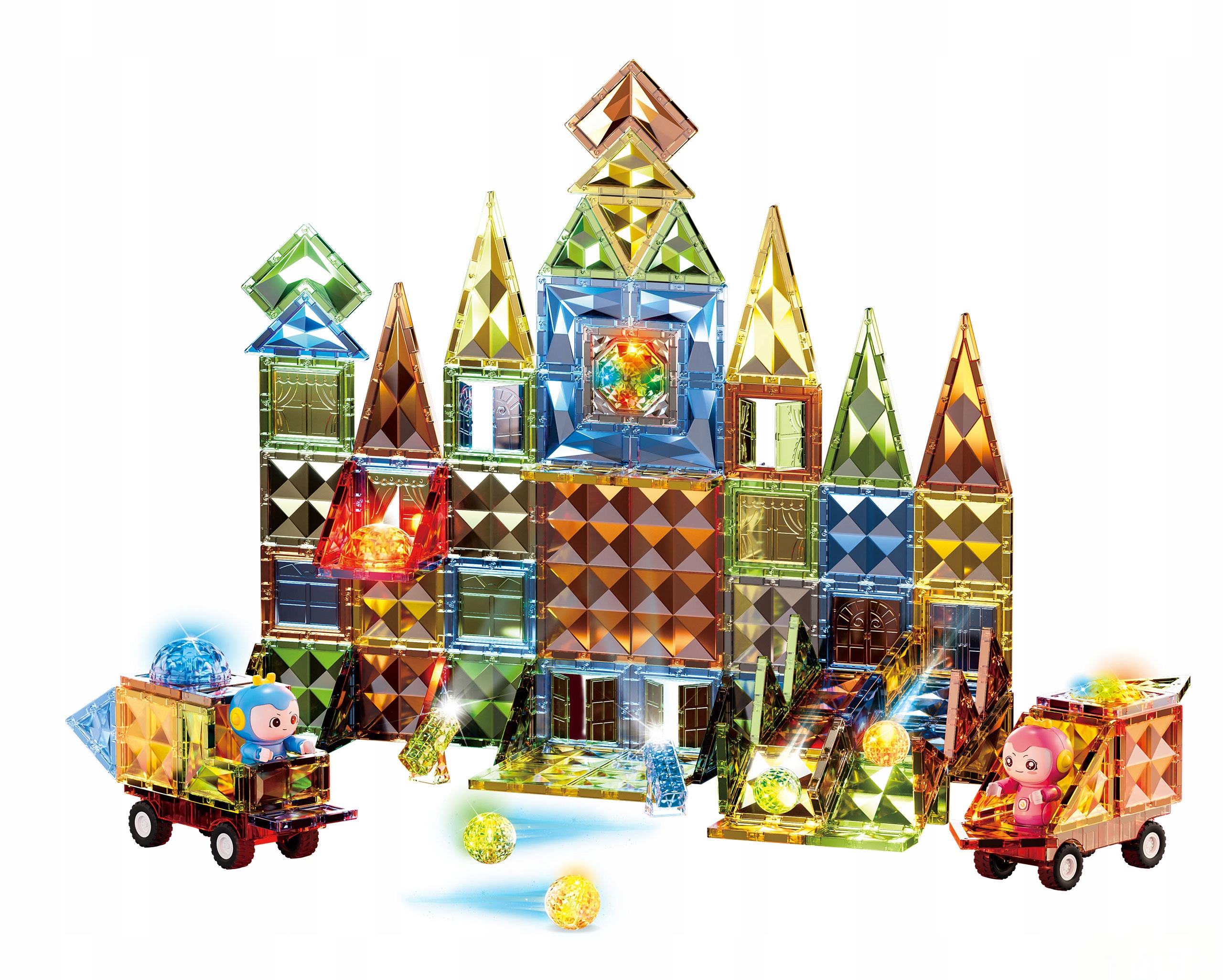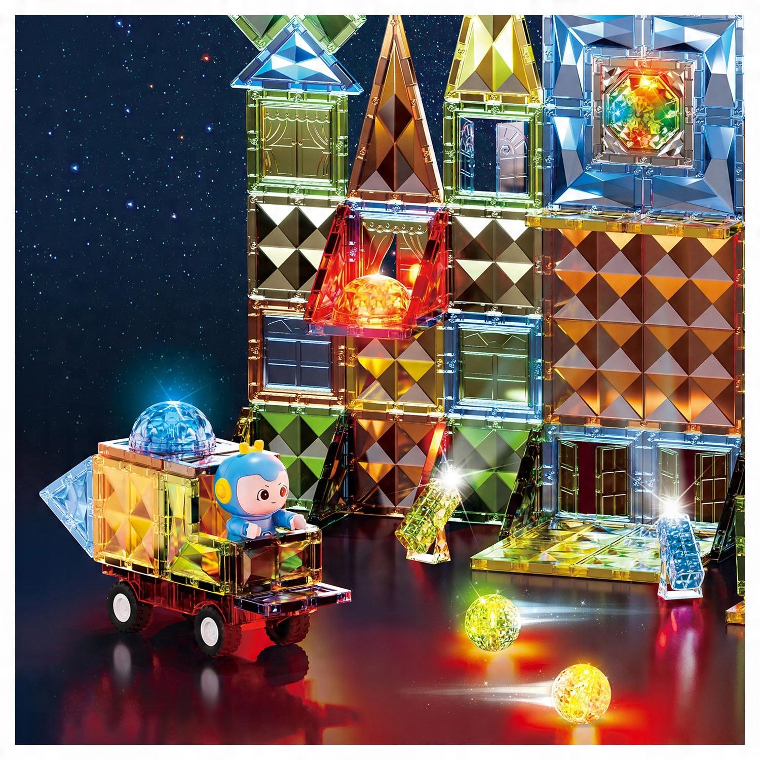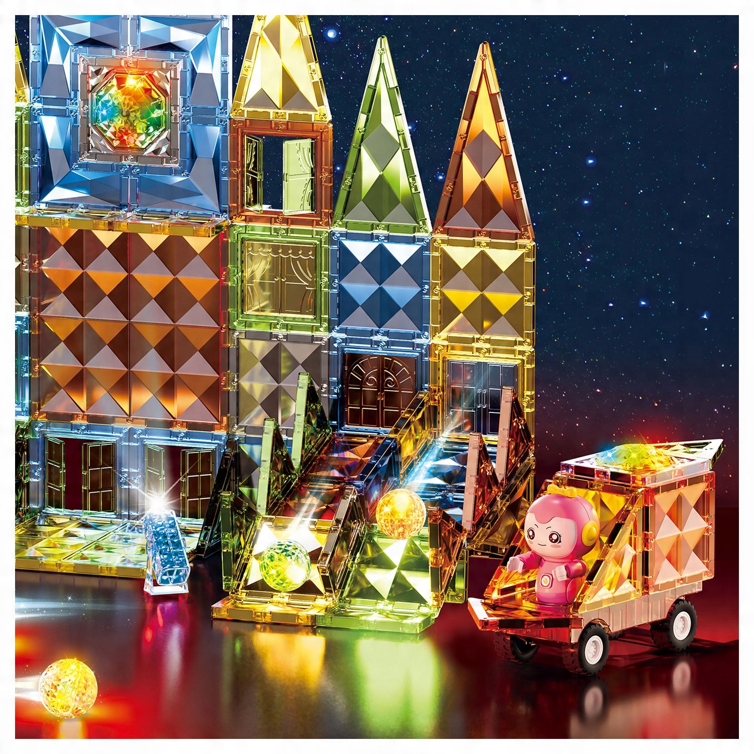 Zestaw pozwala dzieciom tworzyć kreatywne konstrukcje – od pojazdów, przez domki i wieże, aż po zwierzątka czy owoce i obserwować jak światło odbija się od przezroczystych ścianek, tworząc hipnotyzujące refleksy. Efektowne wykończenie powierzchni oraz dołączone świecące kule LED sprawiają, że każda budowla zmienia się w wyjątkowe świetlne dzieło.