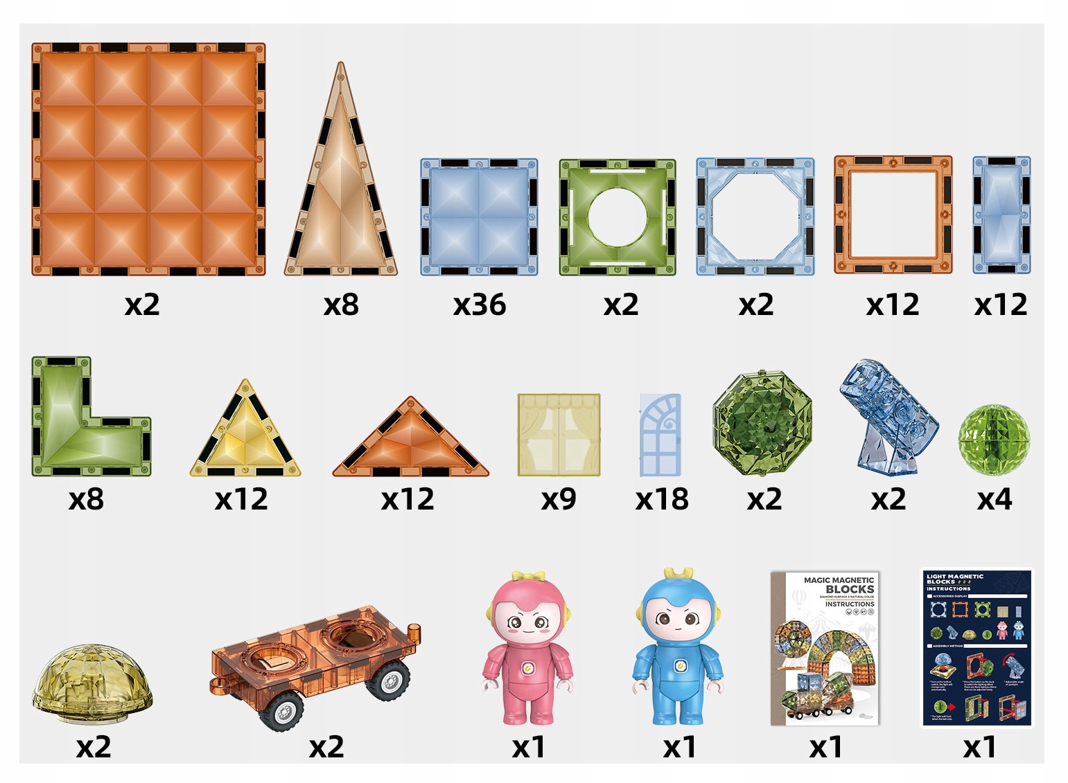 Elementy są lekkie, solidne i łatwo się ze sobą łączą dzięki wbudowanym magnesom, co pozwala dzieciom budować wciąż nowe konstrukcje. Kolory elementów zostały specjalnie dobrane aby idealnie współgrały z elementami świecącymi.