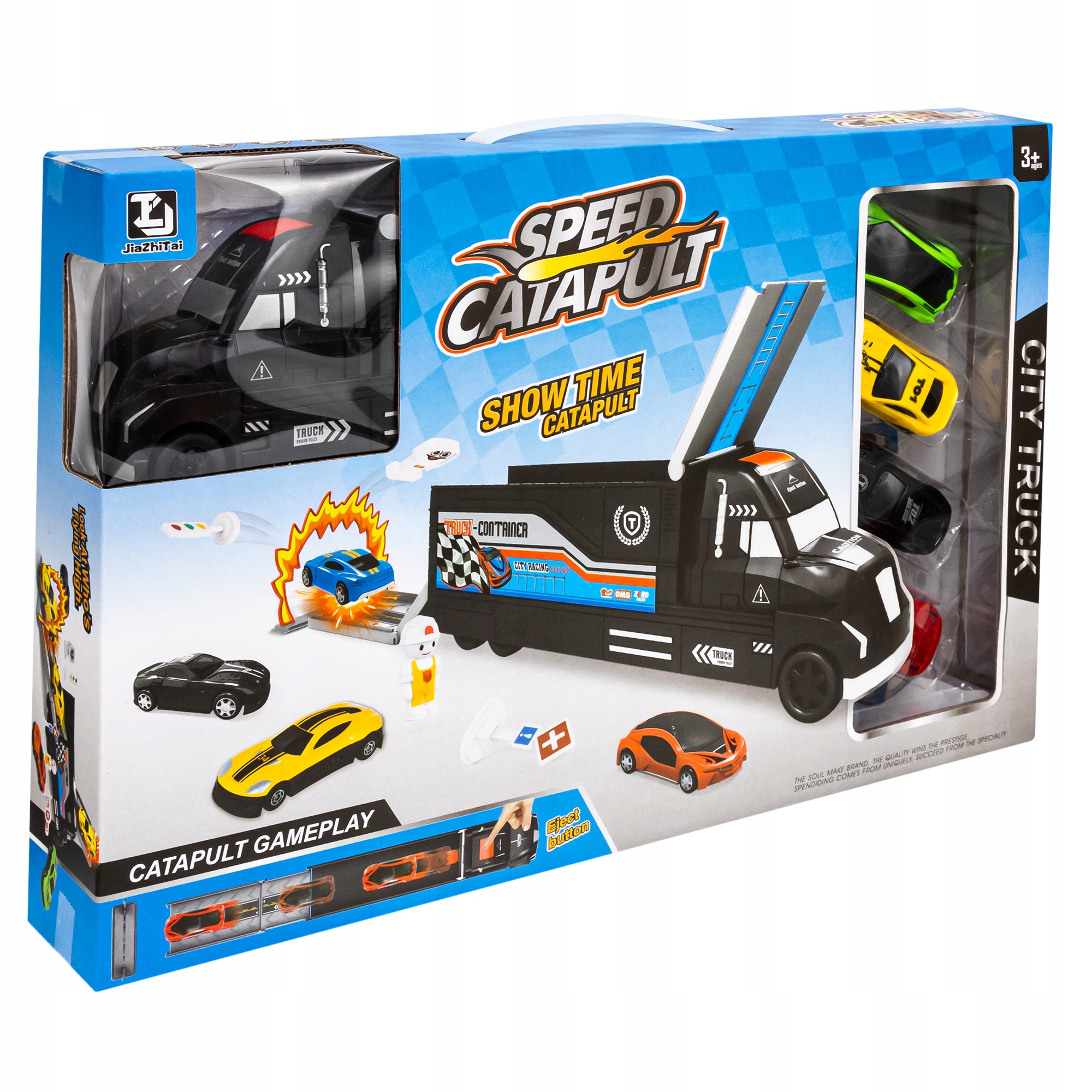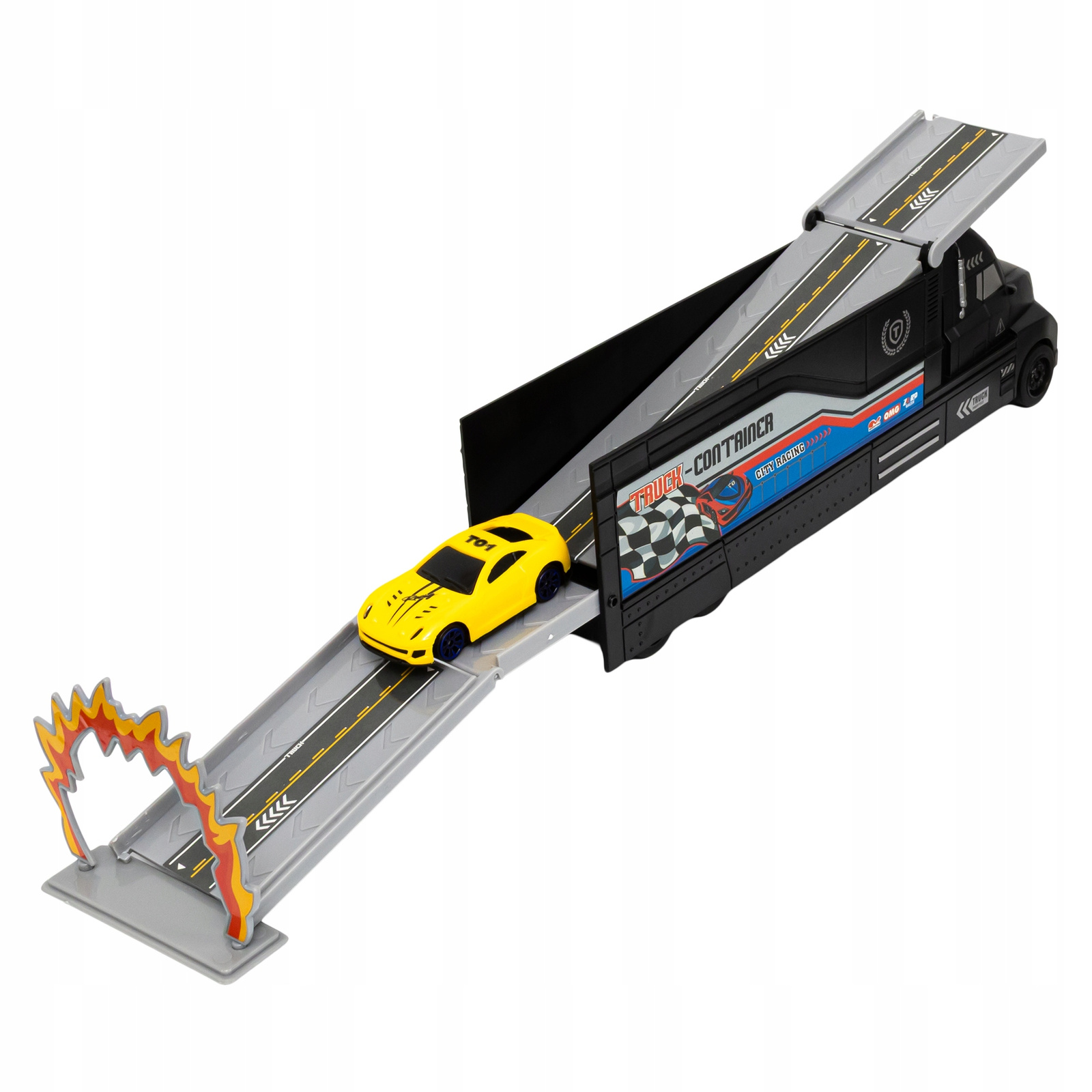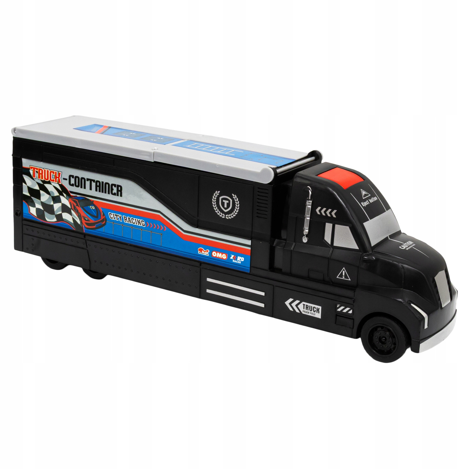 Tir to także wystrzałowa wyrzutnia! Wystarczy ręcznie zaciągnąć czerwony mechanizm w naczepie, ustawić autko i nacisnąć przycisk strzału. Samochodzik z dużą prędkością przejedzie przez ciężarówkę i wyskoczy. Frajda z zabawy nie tylko dla najmłodszych!