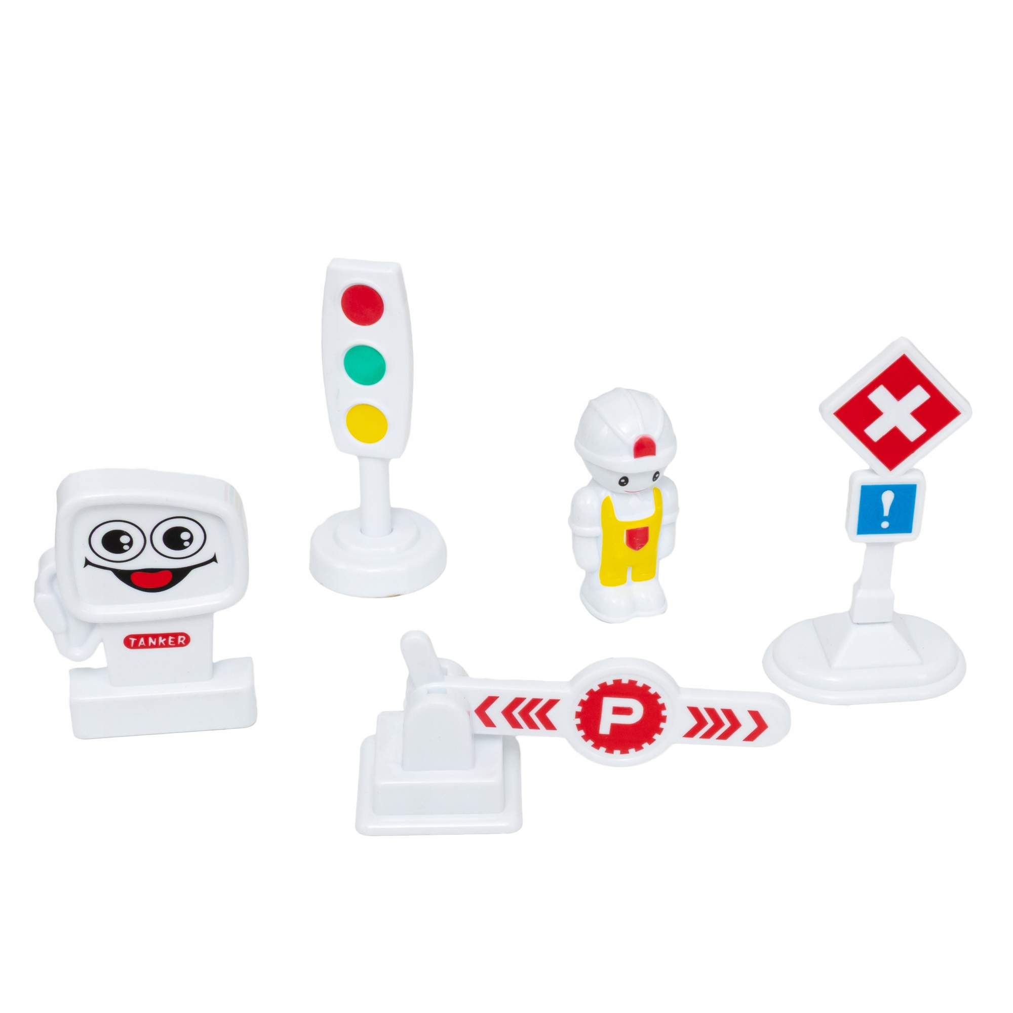 W zestawie znajdziesz także elementy dekoracyjne, dzięki którym stworzysz stację benzynowo-parkingową. Wesoły ludzik przypilnuje porządku. Razem z nim znajdziesz także szlaban, znaki drogowe oraz dystrybutor paliwa.