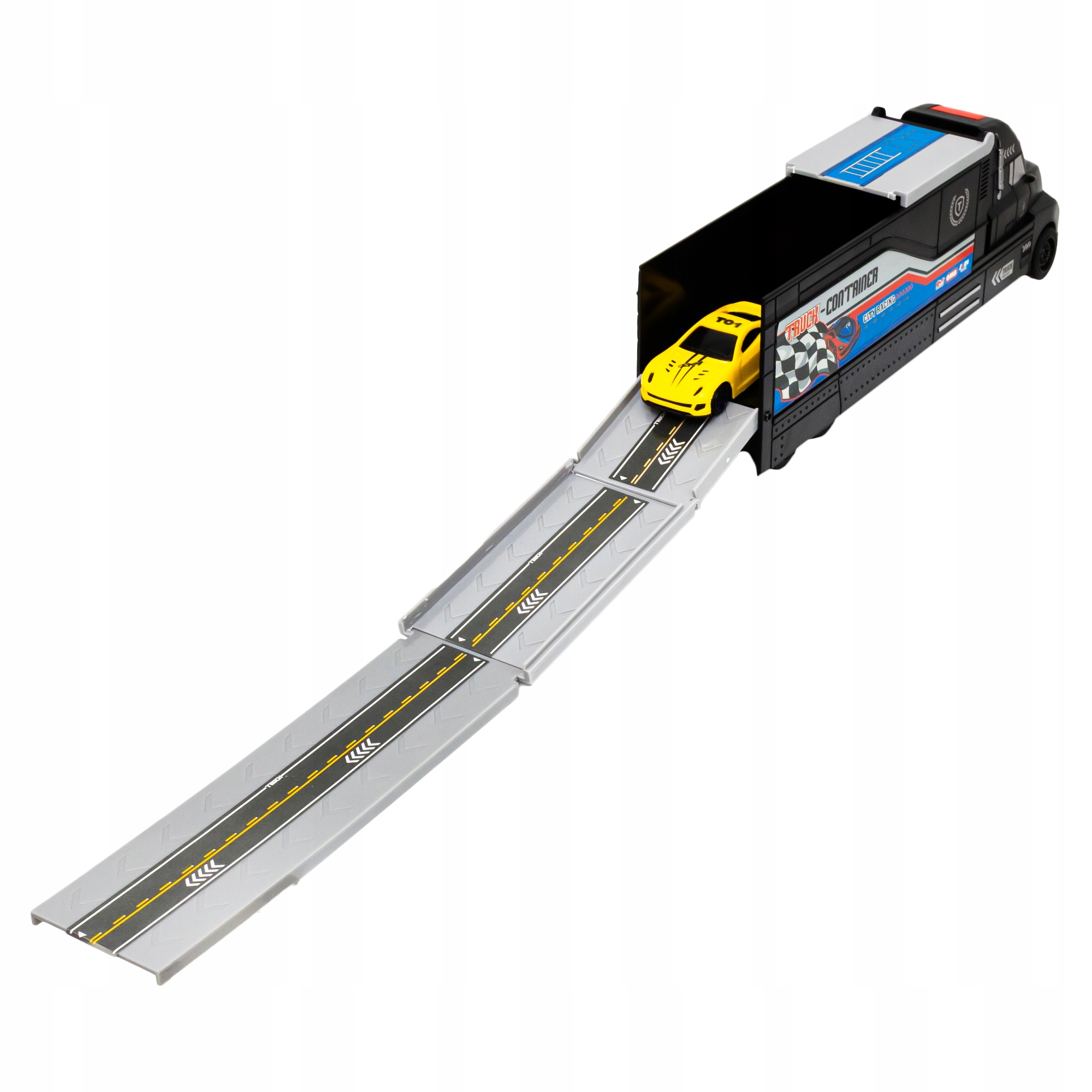 Aż 4 różne kolorowe pojazdy wyścigowe. Świetnie przemyślana konstrukcja pozwoli na uporządkowanie pojazdów. Teraz wszystkie będą pod ręką, w naczepie Twojego auta ciężarowego!