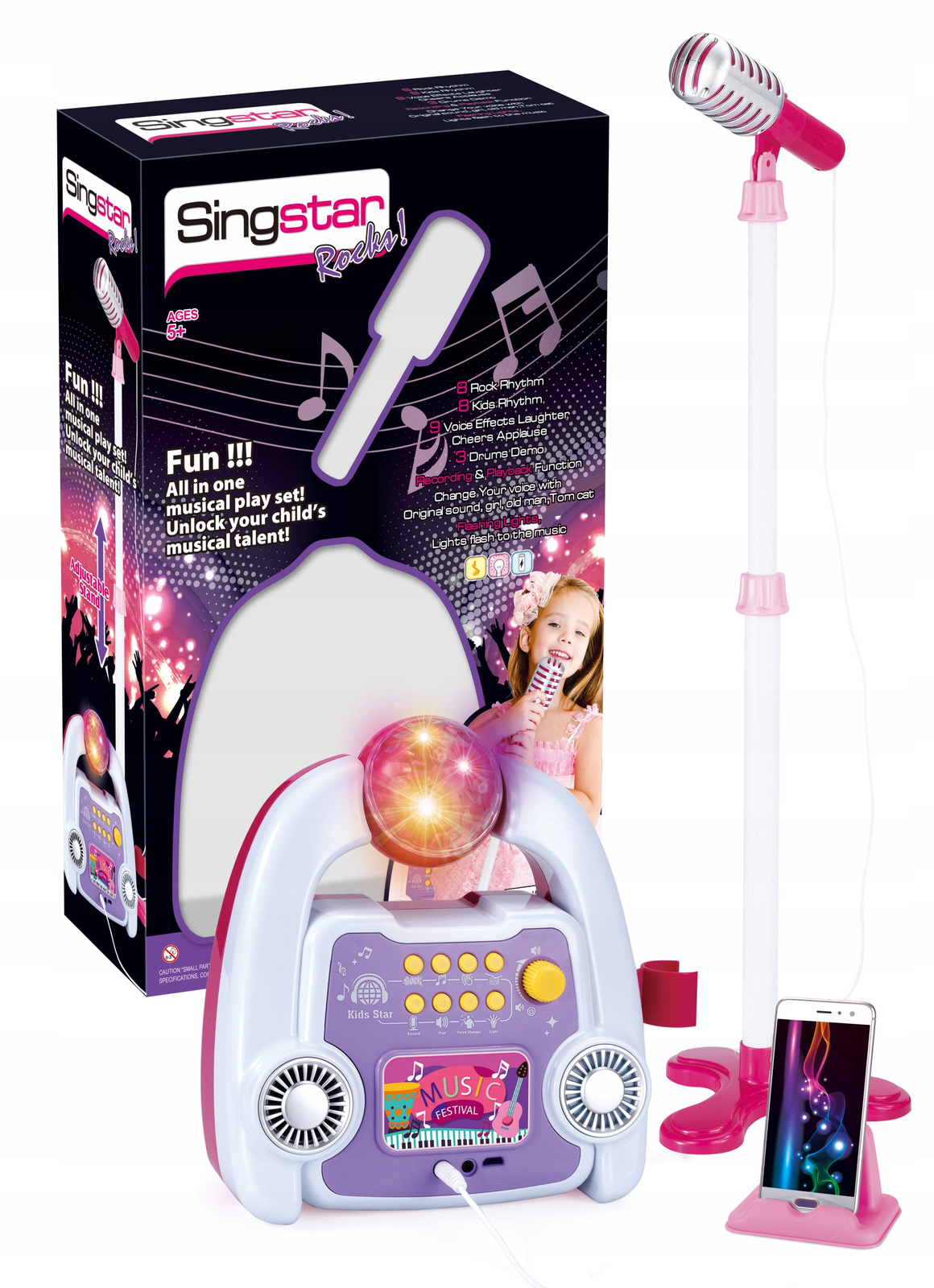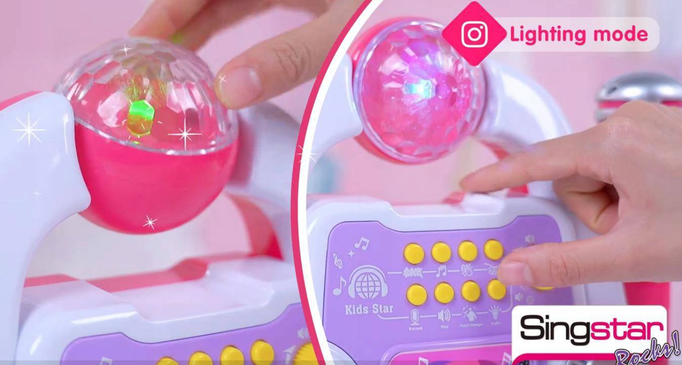 Zrób swojemu dziecku wspaniałą niespodziankę i kup mu profesjonalny zestaw z mikrofonem, statywem i kulą pełną kolorów. Zabawka posiada wgrane melodie, regulację głośności, efekty świetlne a nawet funkcję mp3 dzięki której można odtwarzać ulubione piosenki z telefonu. Dodatkowo statyw ma regulowaną wysokość, więc rośnie razem z Twoim dzieckiem!