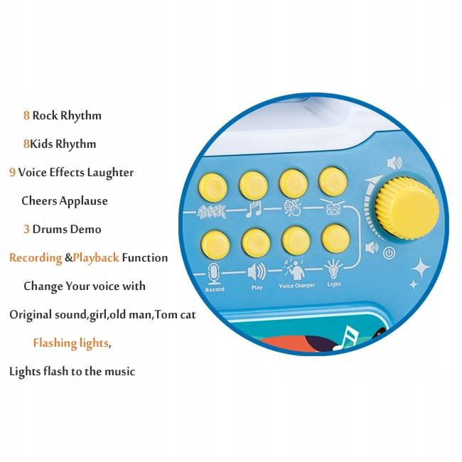 Twoje dziecko może śpiewać do melodii z zabawki albo podłączyć mp3 i włączyć swoje ulubione piosenki, np z telefonu. A to nie koniec niespodzianek! Jeśli będzie zadowolone ze swojego występu, a na pewno będzie ;) może włączyć sobie brawa oraz wiwaty. Poczuje się jak prawdziwa gwiazda po koncercie!